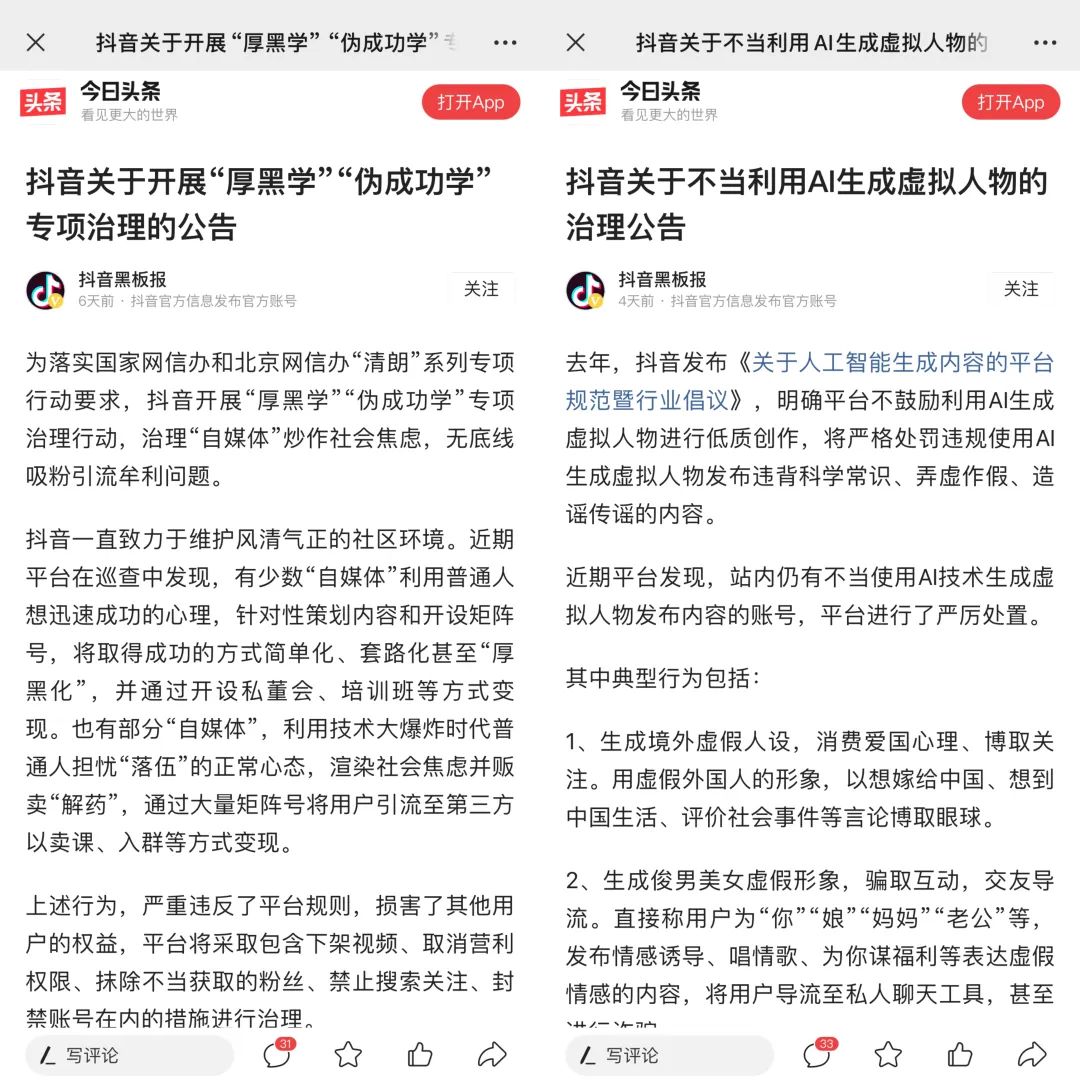 3月25日-3月26日,抖音接连发布两条治理公告,分别是专项治理“厚黑学”“伪成功学”,和不当利用AI生成虚拟人物。在公告中,抖音提到这两类账号共同存在低质吸粉、引流卖课等“割韭菜”行为。