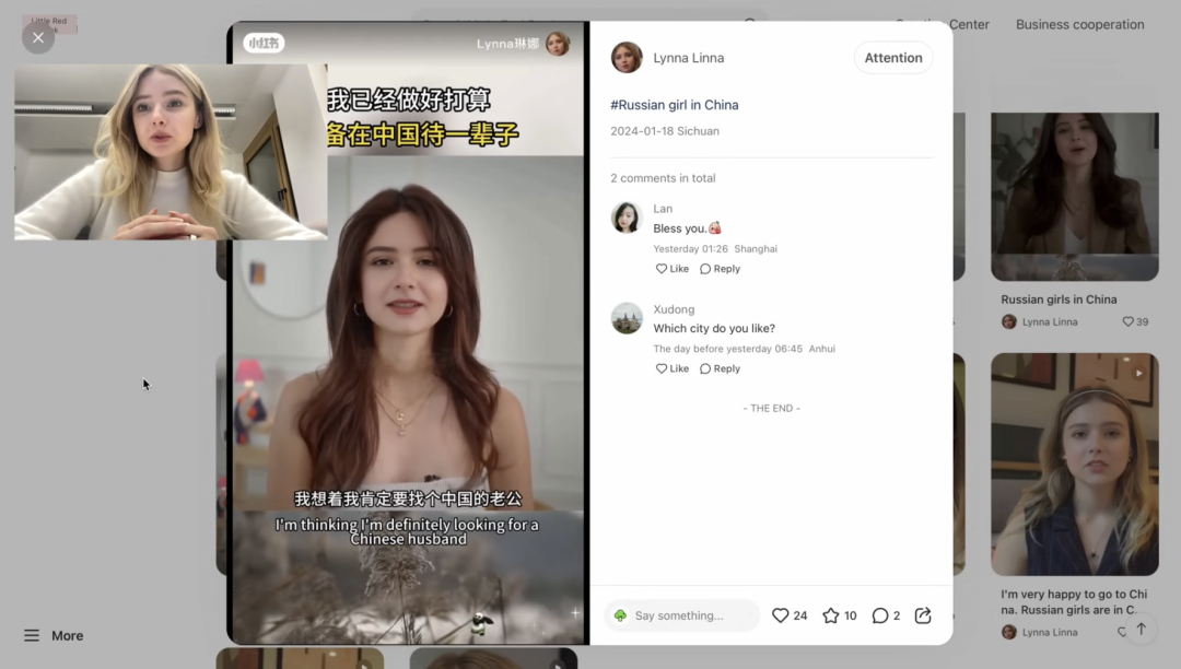 今年春节期间,乌克兰网红Olga Loiek曾发布过一条题为《我在中国被人克隆了》的视频,表示自己的脸和声音通过AI技术出现在数十个中国视频账号中,并进行带货,粉丝量超过20万。