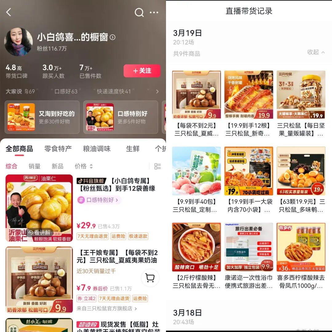 蝉妈妈数据显示,“小白鸽喜乐会(开封王婆)”近90天开播106场,其中带货场次79场,总销售额在25万—50万元,主要带货品牌是各类食品饮料和生鲜蔬果,值得注意的是,三只松鼠旗舰店还专门设置了“王干娘专属”的直播带货链接。