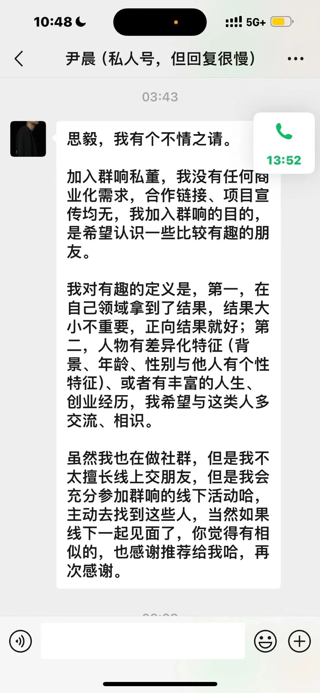 尹老板需要认识有意思的人,有私董会爸爸想认识他吗,哈哈哈哈牛逼。