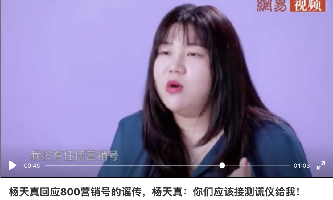 杨天真,毕竟这是坊间流传手握800个营销号的女人啊。虽然她后来辟谣了,但还是有很多人深信不疑。