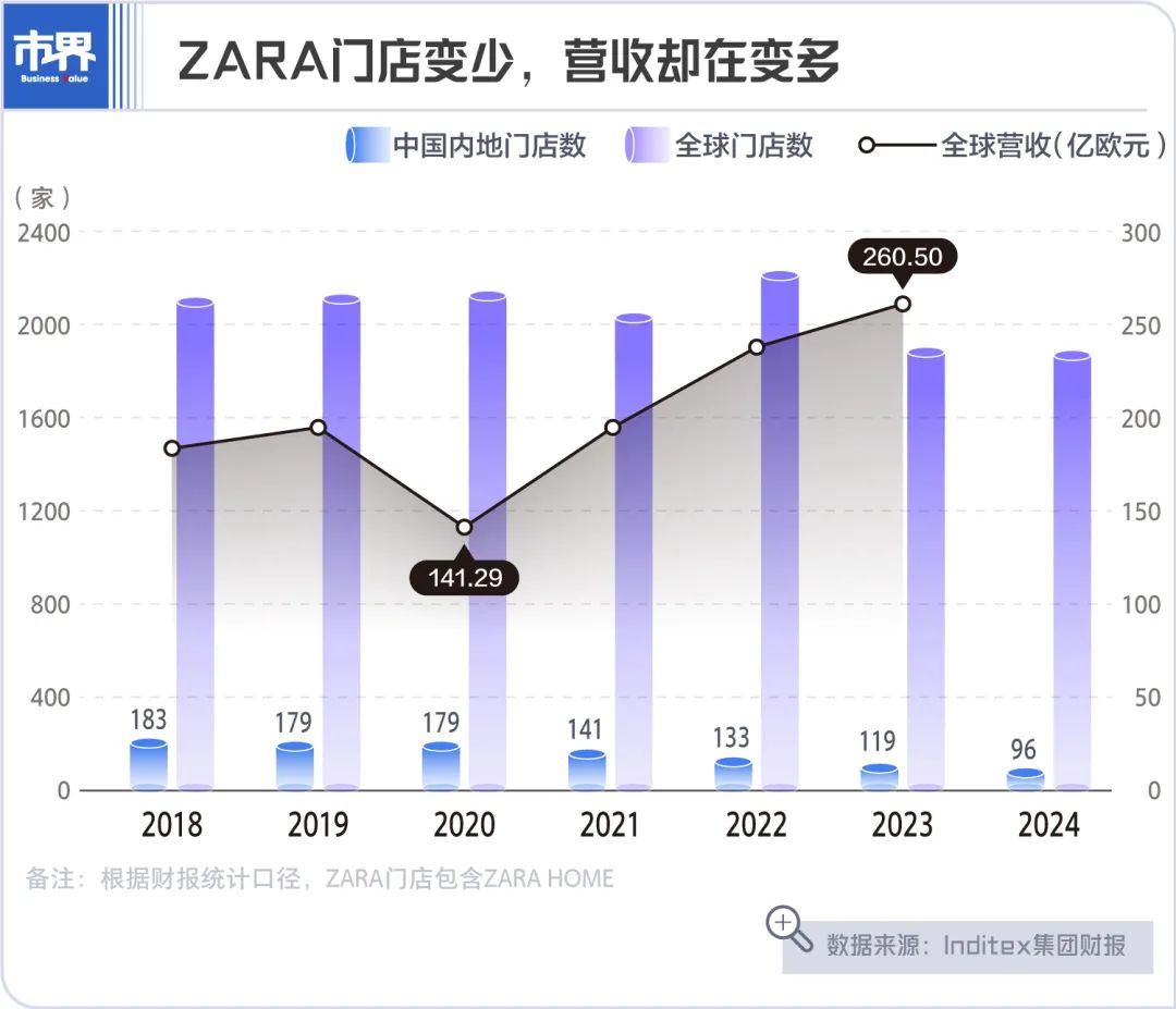 ZARA中国门店数量在大幅缩减,全球门店亦是如此,2018年为2118家,2024年降至1881家。