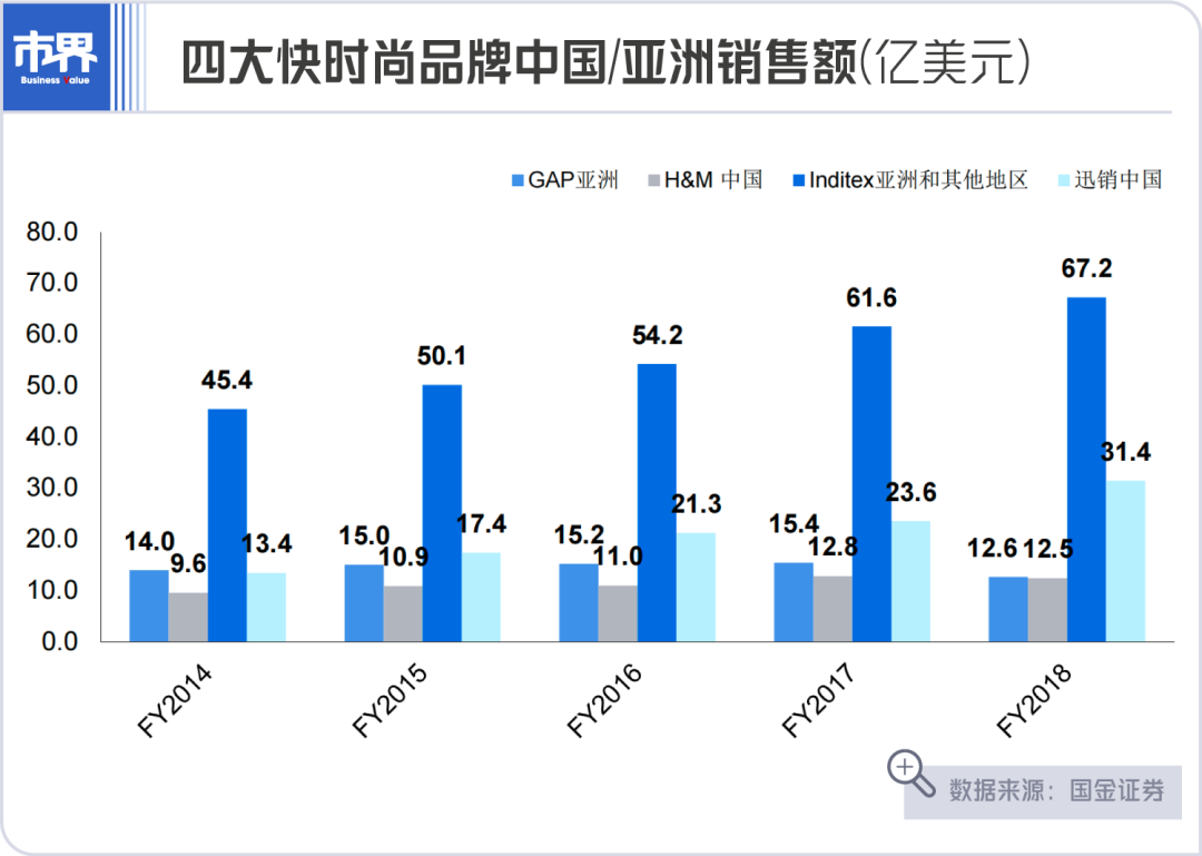 国金证券数据显示,2008至2018年的十年黄金时期,优衣库中国门店由13家增长至633家,增幅为48倍;Inditex以ZARA为主的中国门店由14家增长至593家,增幅为41倍;H&M中国门店由13家增长至530家,增幅为40倍;而GAP亚洲门店由131家增长至372家,增幅为1.84倍。