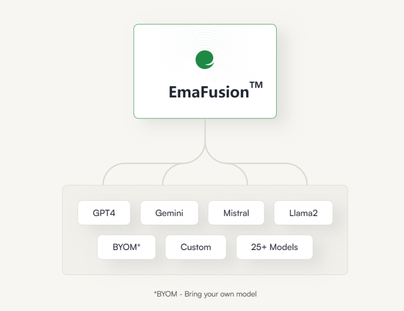 Ema采用EmaFusion™模型,将行业领先的开源和私有模型智能地融合在一起,从而以尽可能低的成本实现最高的准确性。此外,Ema还在不断融合新模型,避免过度依赖单一技术堆栈。
