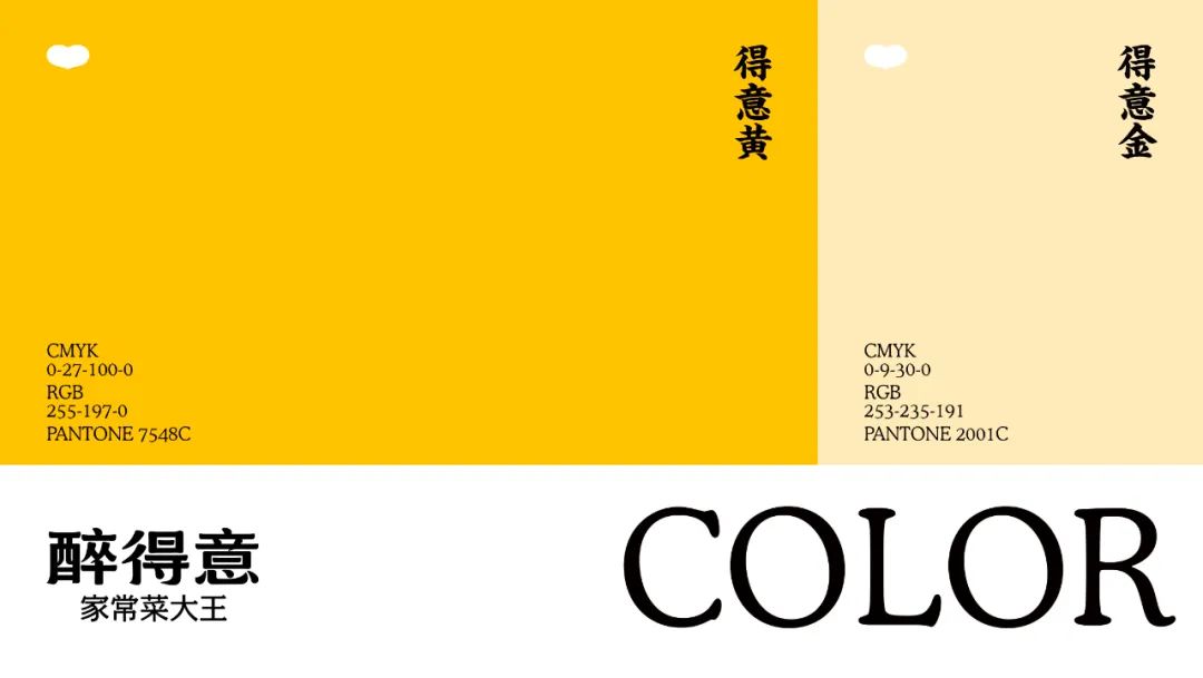我们首先为醉得意选择明亮热闹的正黄色作为品牌色。一方面,黄色的视觉醒目度和穿透力是释放信号的理想载体;另一方面,黄色在店内的应用也能营造出热腾腾的食欲和热闹温暖的用餐体验。