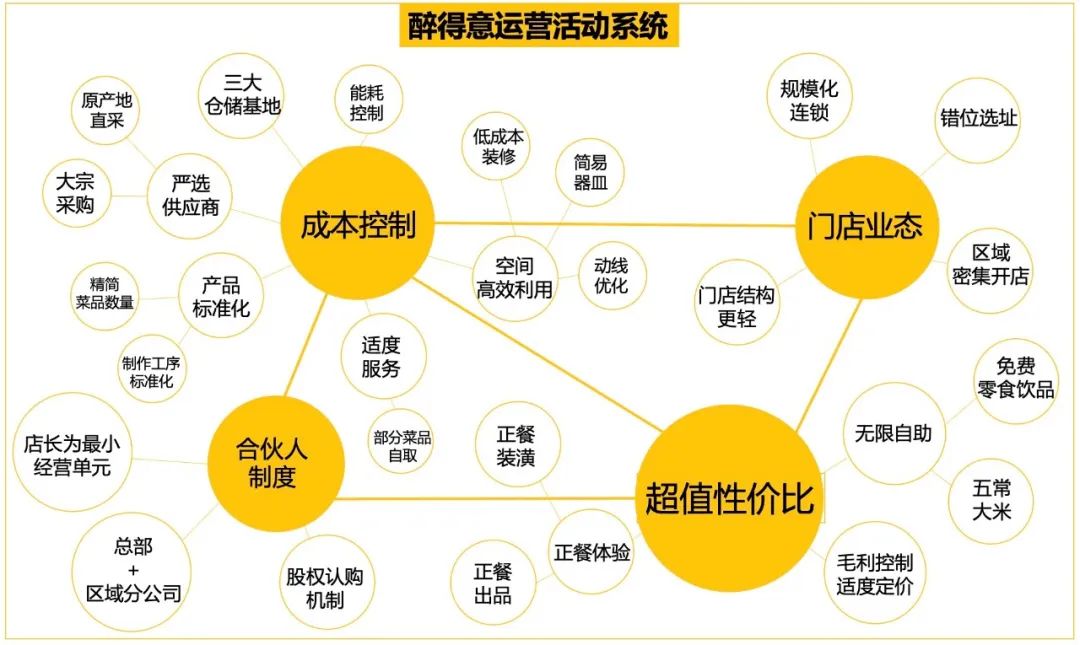 通过企业寻宝,我们发现醉得意经过八年的发展,形成的一系列低成本、高效率的运营活动,这一系列独特的运营活动既是发展的真因,也为醉得意建立起一定的竞争优势,优势体现在成本、定价、组织、供应链、渠道、选址等各方面: