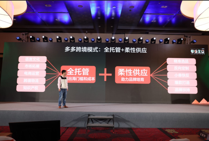 全托管模式对于供给端来讲,商家不需要熟悉外语、平台规则,就是直接进平台的仓库,降低商品供给的门槛。所以基本上解决了供给的问题。亚马逊的供应是怎么解决的?亚马逊为什么在美国特别牛?是因为它在美国和欧洲有很多仓,一个仓放的东西是有限的。在美国做亚马逊的人,特别担心一个事情,卖不掉,会收特别贵的租金,销售不出去就报废了,特别难,所以做亚马逊,它上游的供给是优选的供应链,在中国数以亿计的SKU里面,有十几万个商家搬了几百万个SKU到亚马逊上来。