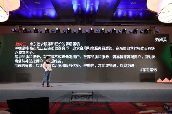 趋势三,京东的问题是追求服务和低价的矛盾困境。追求服务品质跟别人不一样和追求低价,它是矛盾的,很难统一,还会有管理问题等。中国电商市场正在劣币驱逐良币。京东重自营的模式天然缺乏成本优势。三通一达两三块钱全国包邮,京东怎么做?确实很难。追求品质和服务,就不得不放弃低端用户。你要放弃品质和服务,容易得罪高端用户。面对友商低价补贴挖用户,有百亿补贴,你就更难了,进退维谷。有京东高管跟我聊怎么办?我说我也没什么招,强化品质和服务优势,守得住才能攻,以退为进。