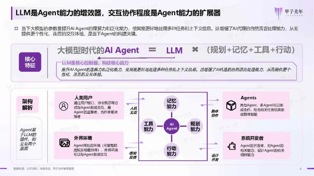 大型语言模型的出现为AI Agent的发展提供了突破性的技术方案。与传统的基于规则的系统相比,基于LLM的AI Agent展现出更强大的自然语言处理能力和泛化能力。这意味着AI Agent能够处理更广泛的数据类型,适应更多样的场景,从而在实际应用中发挥更大的作用。