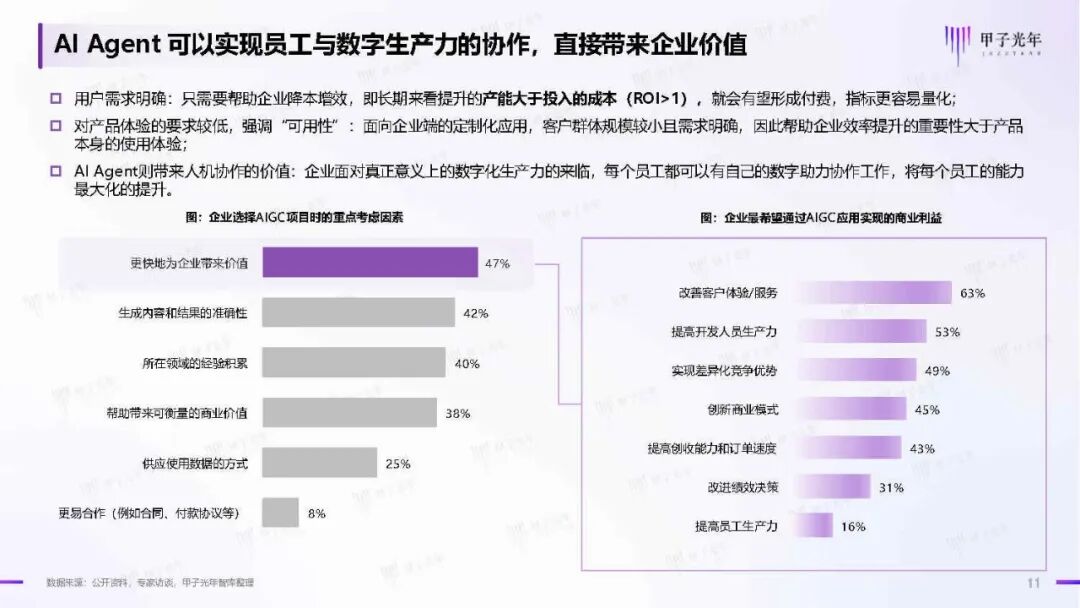 报告显示,AI Agent市场正处于早期阶段,但已经展现出巨大的商业潜力。企业通过AI Agent实现降本增效,提升员工生产力,改进绩效决策等目标。AI Agent的商业价值不仅体现在直接的经济效益上,更在于其推动工作范式转变的能力,为企业带来差异化竞争优势。