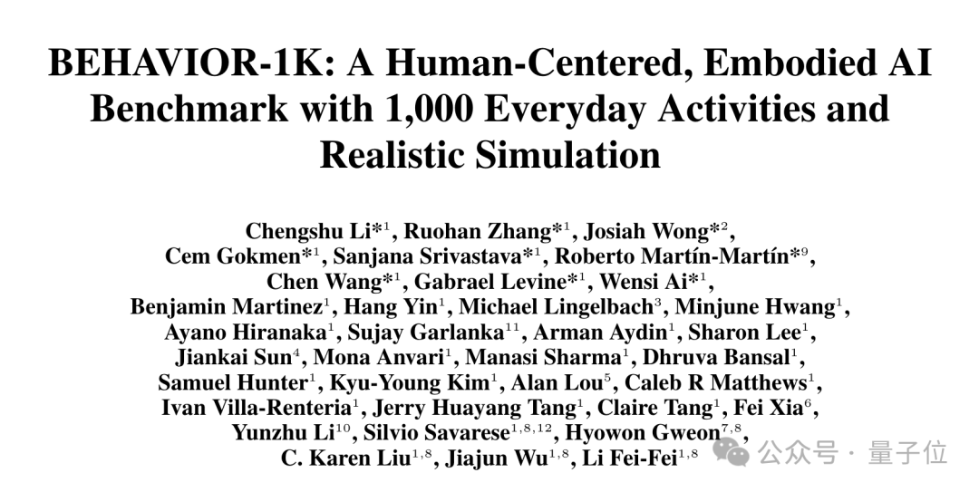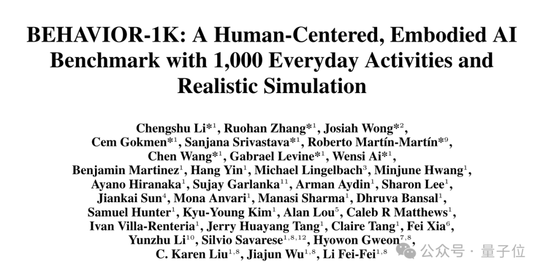 比如上个月发布的一项涉及1000多种人类日常活动的具身智能Benchmark,李飞飞就有参与其中。