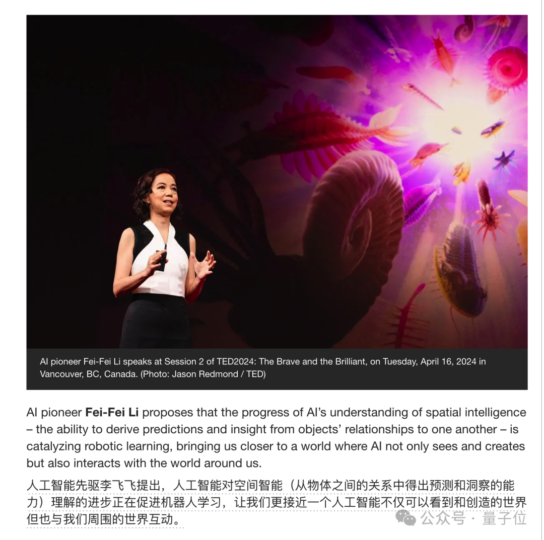 上个月,李飞飞在温哥华举行的TED大会中发表了主题演讲,内容正是与空间智能相关。