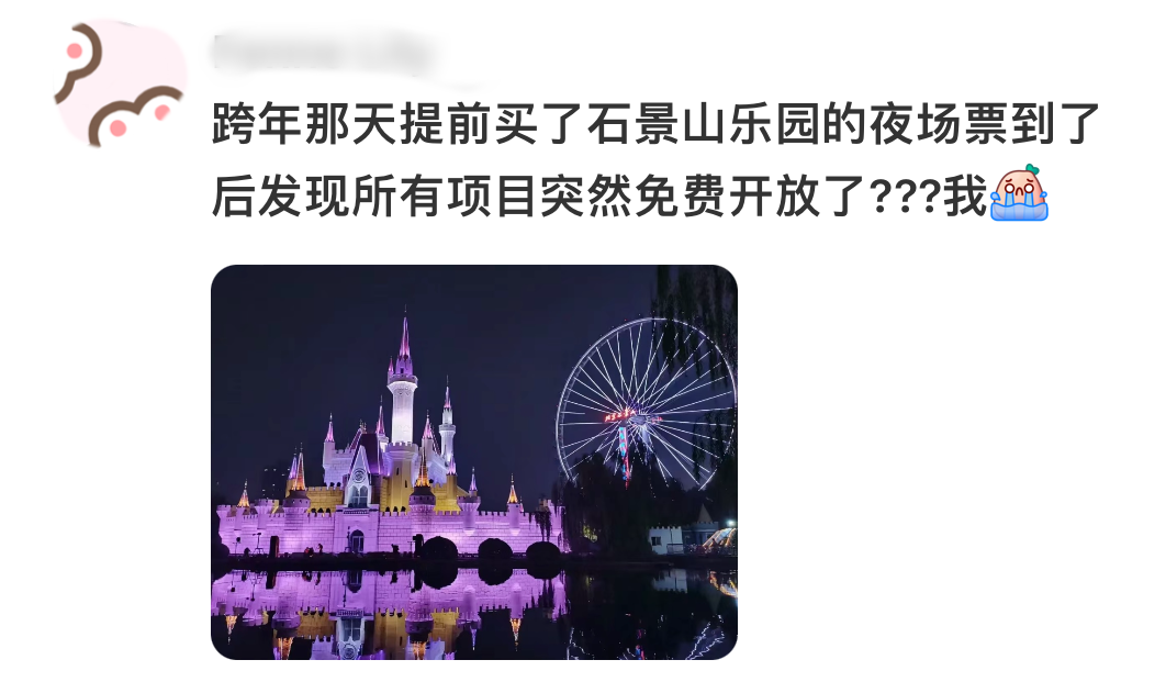 甚至有人在跨年夜买好了石景山游乐园的夜场票,到了后才发现所有项目都免费开放了。