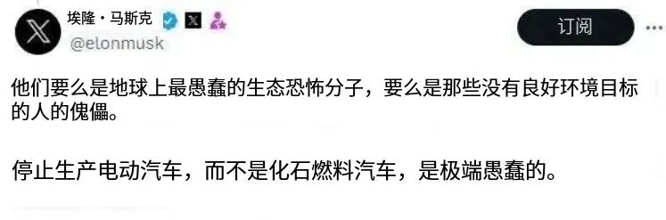 随后,马斯克在社交媒体平台X上回应,“这些要么是地球上最愚蠢的生态恐怖分子,要么是那些并不持有环保目的的人的傀儡。停止生产电动汽车,而不是化石燃料汽车,这种做法愚蠢至极。”