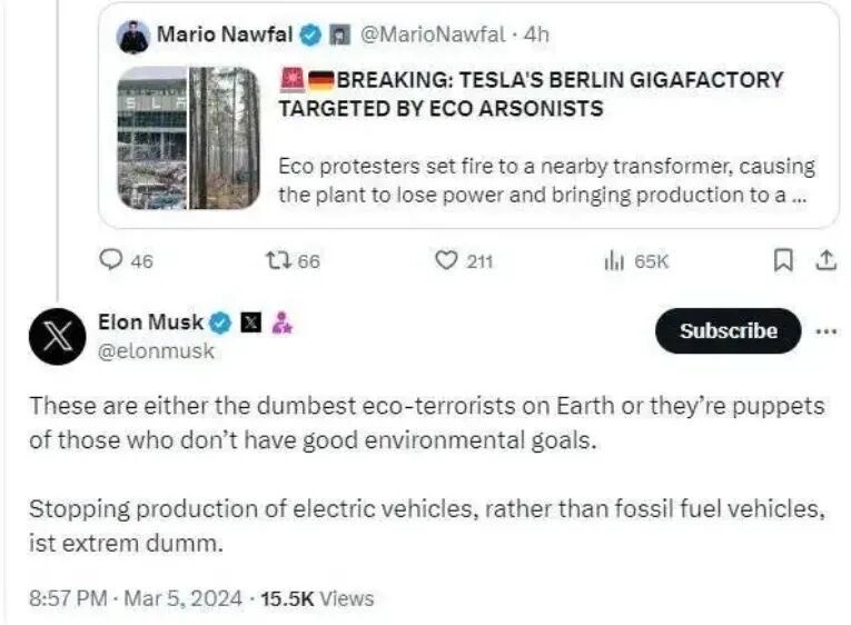 今年3月5日,特斯拉柏林工厂还遭到极端环保人士纵火,他们点燃了特斯拉工厂附近的变电站,导致该工厂被迫停产。