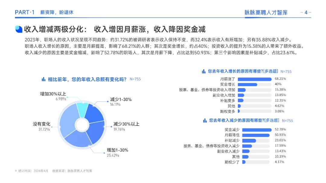 报告还告诉我们,31.72%的人表示去年收入没变,而有32.4%的人收入增加了,这听起来不错,对吧?但别急,还有35.88%的人收入减少了。增加的原因主要是月薪涨了,而减少的原因,竟然是奖金缩水了。