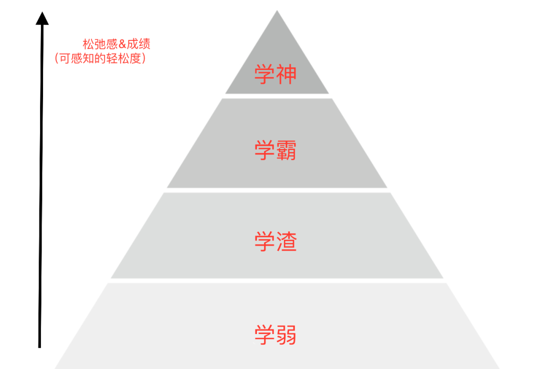 最高高在上的就是学神,看起来没在念书但就是成绩很优秀;学霸成绩和学神差不多,但每天都在努力,临考前要开夜车;学渣就是成绩不怎么好,也看起来没在读书的;学弱在食物链的最底层,虽然很努力地学习,但成绩还是不太好。