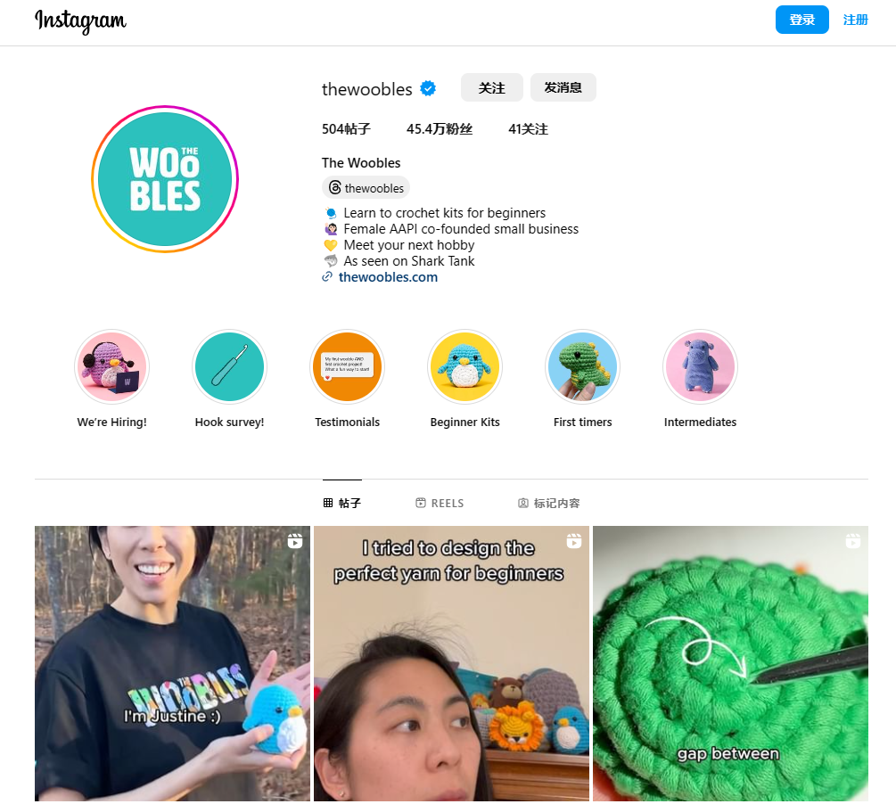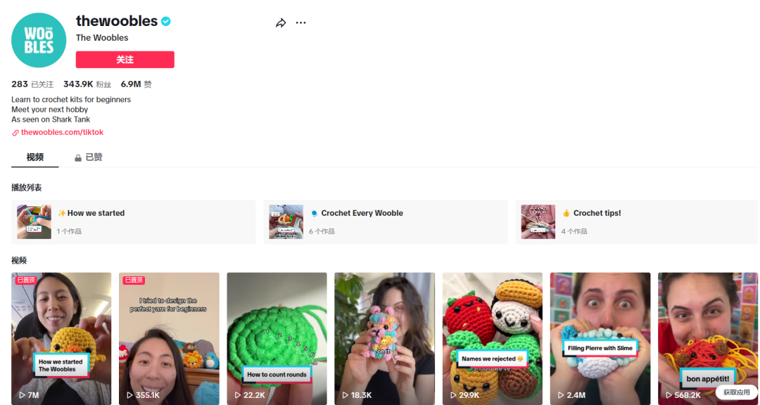 Tik Tok:The Woobles的运营策略是很成功的,和垂直领域的KOL合作,发起话题挑战、邀请用户参与互动等方式,增加粉丝的参与度。同时还会展示The Woobles的品牌故事、企业文化和核心价值观,增强品牌的认同感和忠诚度。目前粉丝34.3万。