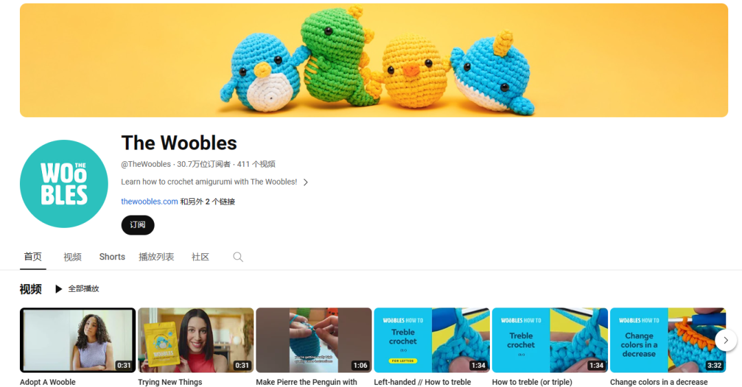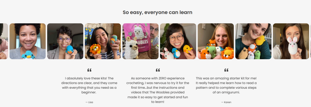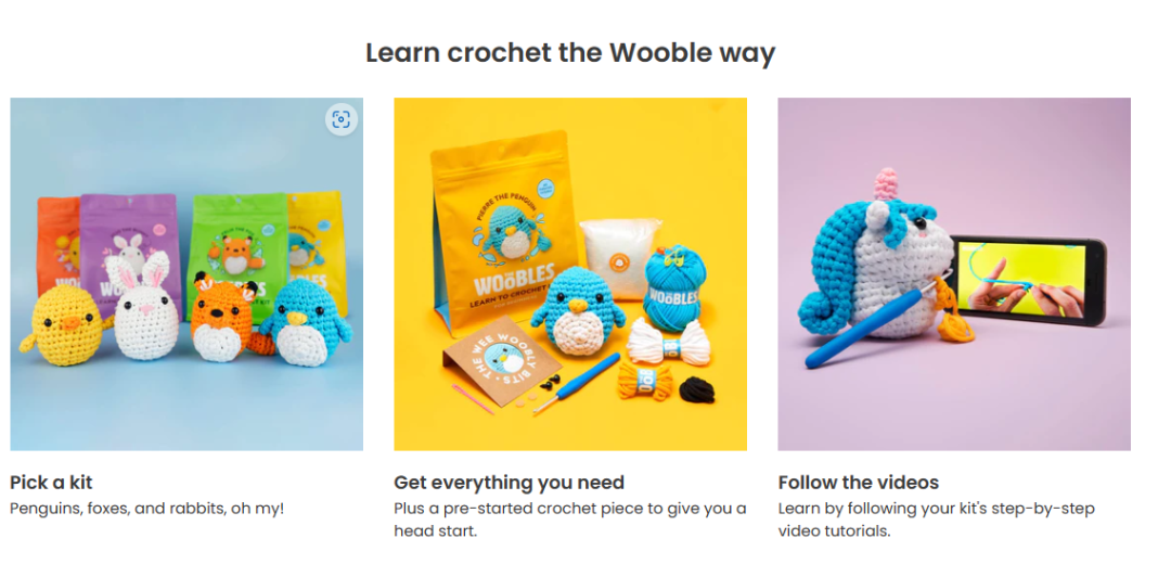 The Woobles网站banner首图就写着“Learn to crochet kits for beginners”,给每一个不会编织的人一个机会,就算你是个新手或不是爱好者也可以学习,这对于一些因工作压力大想寻找治愈的人来说是一种心灵的抚慰。同时也扩大了受众群体。