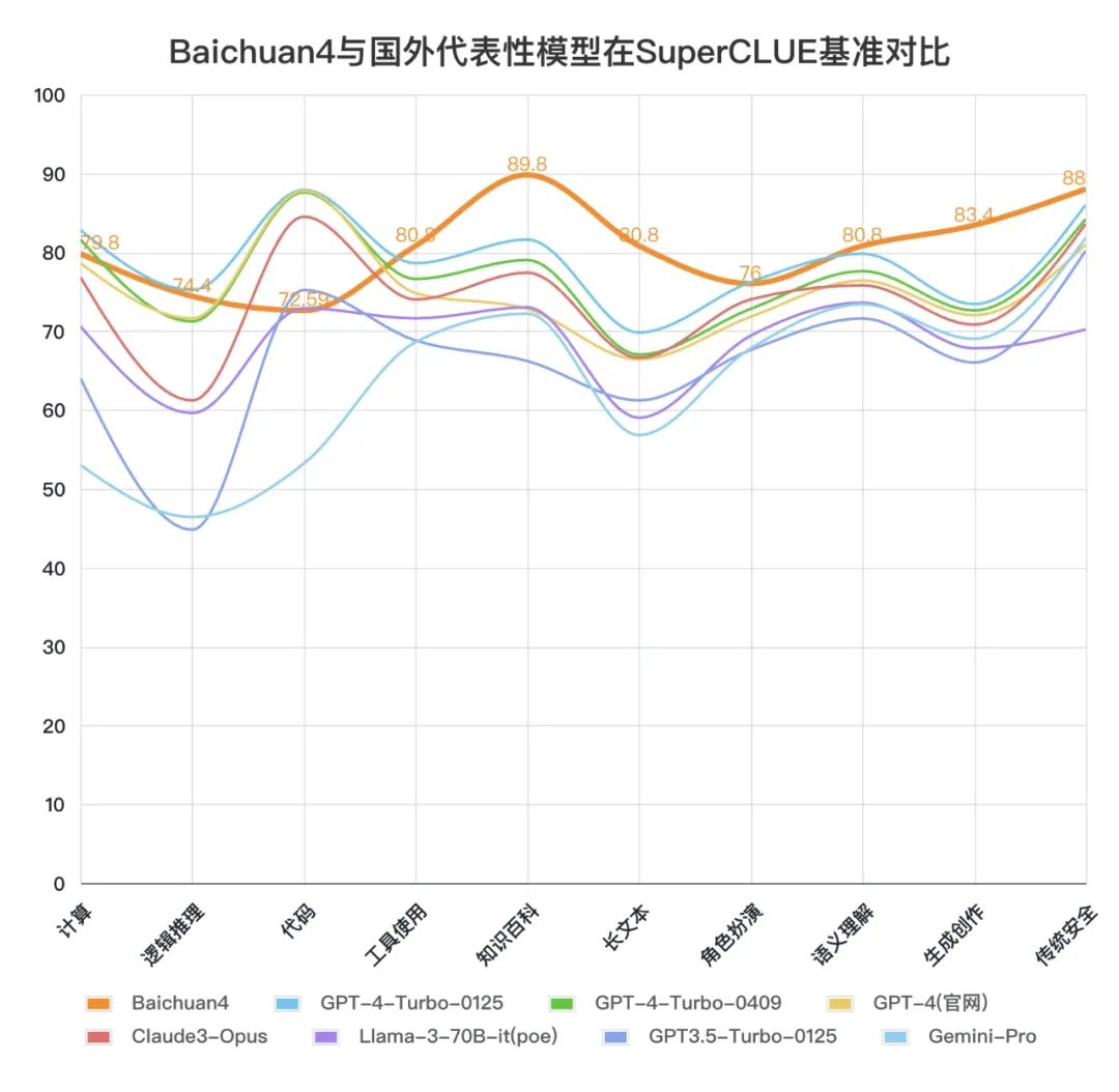不过王小川的发布显然比较切近实际,并没有夸张宣称超越了 GPT-4:「在 SuperClue 上我们拿到第一,数据是真实的,但是并不代表能力上超过了 GPT-4。和国外模型作对比,能看到像知识百科、文本创作或者安全里是遥遥领先的,在代码、逻辑这几条线条里可以看到国际模型更加领先。」