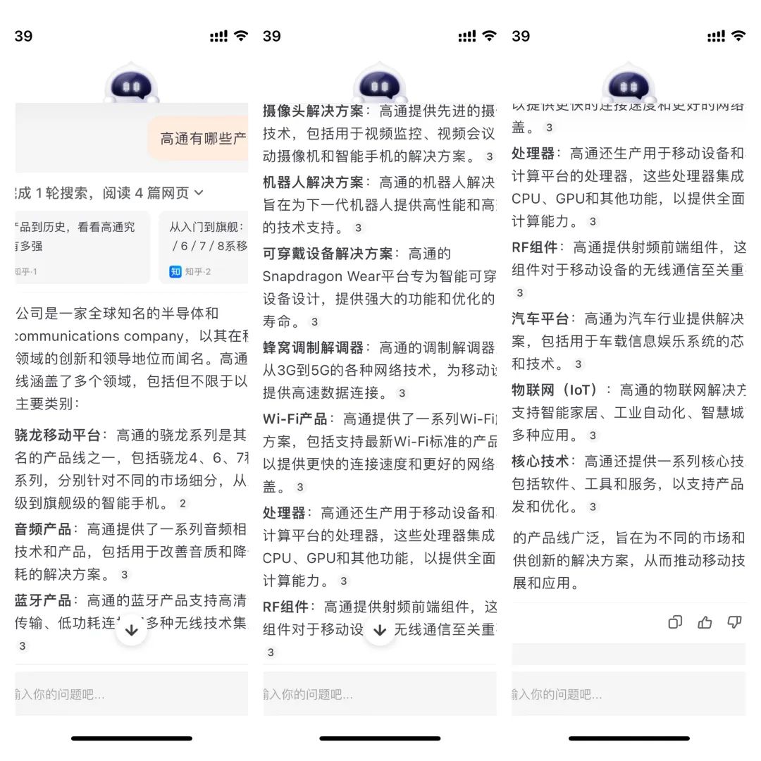 比如在询问「高通有哪些产品线」这一问题的时候,百小应给出的结果有八百多字,而秘塔搜索的「深入」模式(共有简洁、深入、研究三种模式)给出的回答大概为六百多字。Kimi 的回答大概五百多字。