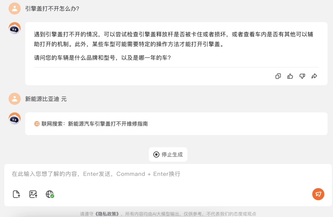百川智能自己提供了一个真实用户案例。「我们的员工问了百小应一个问题,引擎盖打不开了怎么办。国内流行的模型,回答大同小异,会提供一些办法。但是百小应会问你车的品牌以及型号,以及是哪年的车,然后去具体搜索维修点信息等等。」