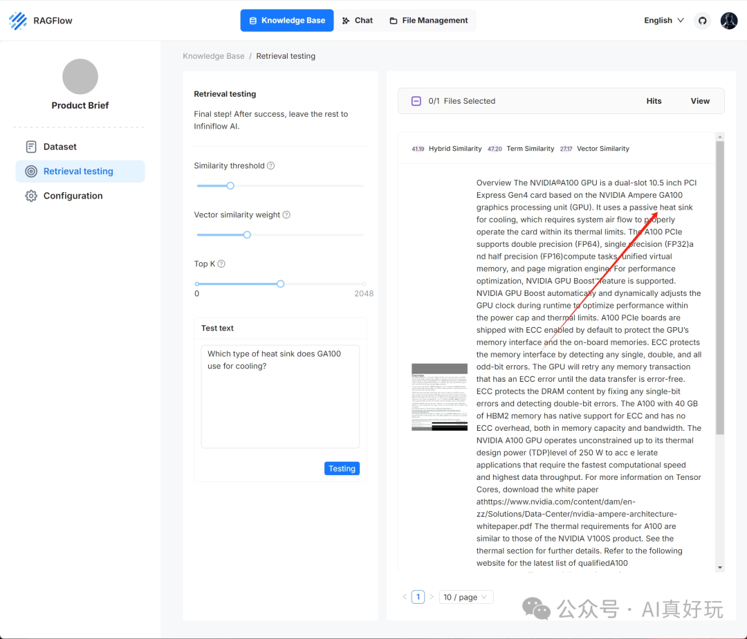 在检索测试中,在测试文本中提出一个快速问题,以仔细检查您的配置是否有效: 从下面的内容中您可以看出,RAGFlow 以真实的引用进行了回应。