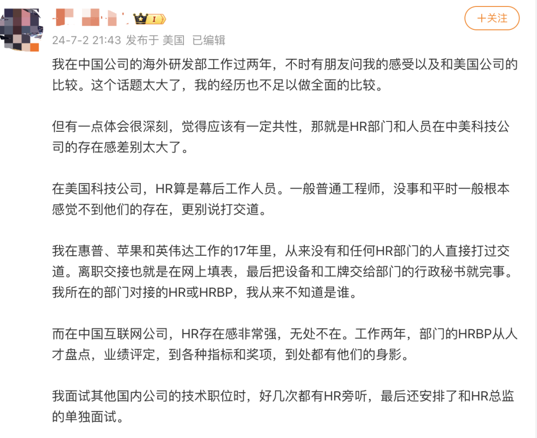 身在硅谷的网友也介绍自己经历:“我在惠普、苹果和英伟达工作的 17 年里,从来没有和任何 HR 部门的人直接打过交道。”“而在中国互联网公司,HR 存在感非常强,无处不在。”