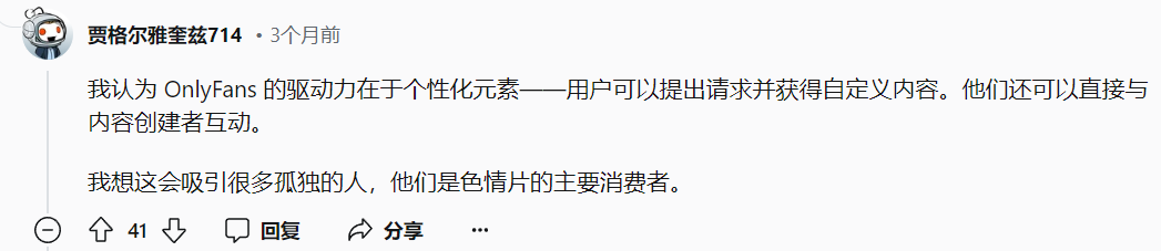 ▲有网友表示,当前(使用AI代聊的)OnlyFans,其互动是个性化的,这给孤独的人很大的吸引力。(来源:Reddit)