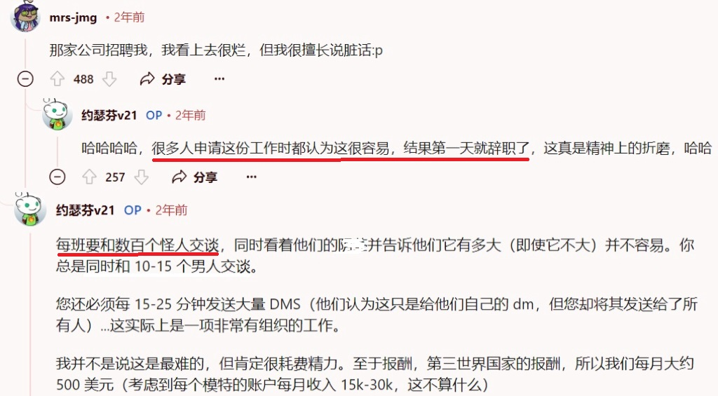 2022年时,Reddit上有OnlyFans的外包公司员工开贴曝光,“OnlyFans 上的女孩实际上并没有和你说话……是我们在聊天”。