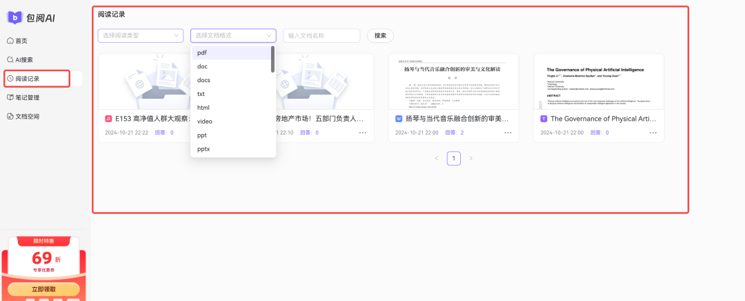 第二个想聊的周边功能是:阅读记录。我们上传过的每一个文档,都会被存放到「阅读记录」这个地方,并且还能根据阅读类型、文档格式、文档名称来进行搜索,对用户很是友好。这样就不用担心后续上传太多文档,不知道从哪里找起,同时也可以作为一个文档存放的平台来供寄己使用。