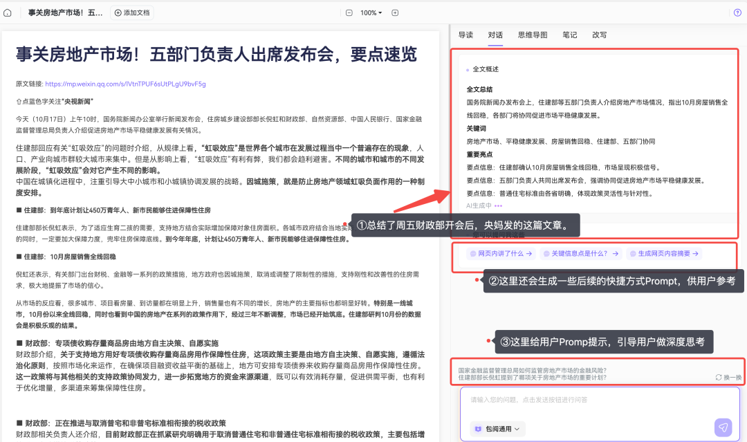 比如,我们让包阅AI来帮我们总结下上周五财政部开会后,央妈发的这篇文章:https://mp.weixin.qq.com/s/lVtnTPUF6sUtPLgU9bvF5g。