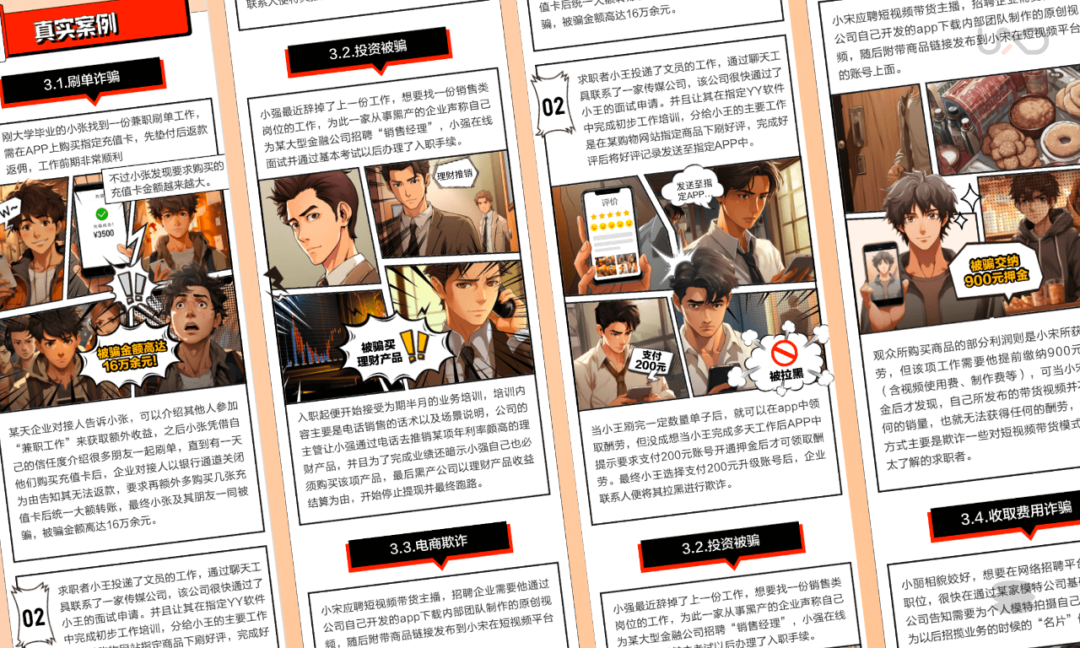 打造沉浸式故事感,引导用户看完典型欺诈案例,警惕类似事件发生。