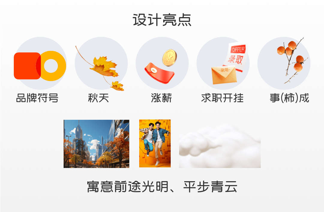 可以将柿子、红包、金币、白云、offer、秋叶等氛围元素融合到一起,可以AI单独生成,也可以用平时积累储备的素材。