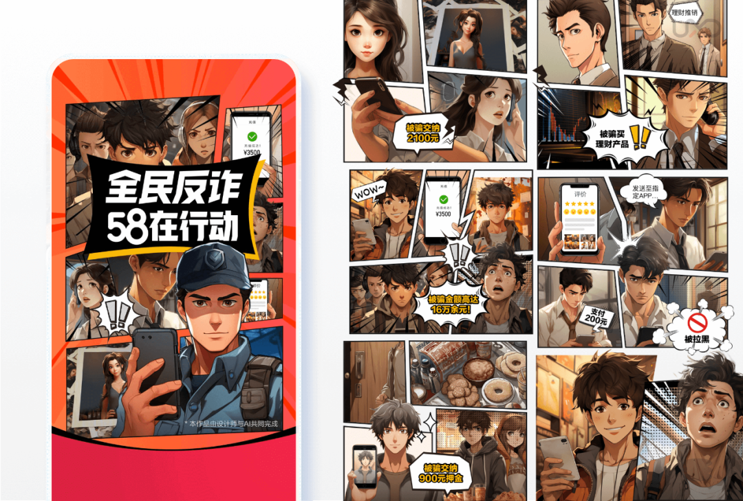 如果色彩过于灰暗会让人压抑、紧张,有时描述词需要加入明亮些的色彩进行调节,比如:反欺诈这个专题,加入了58招聘橙红的品牌色。