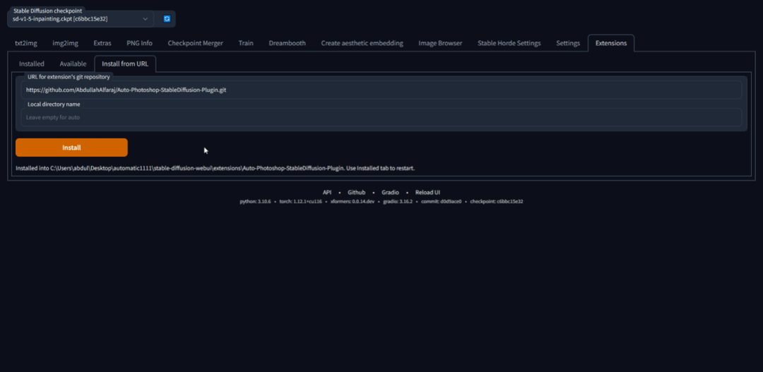 ● b) 将 URL 粘贴到 auto1111 的扩展选项卡中,然后单击安装