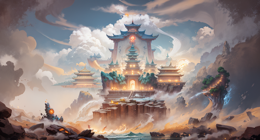 同样对于背景氛围这一块也是进行了上述同样的操作(这里不再赘述,可以多多尝试):先手动使用PhotoShop预处理再AI细化,下图中的一些建筑用到了游戏里的素材。