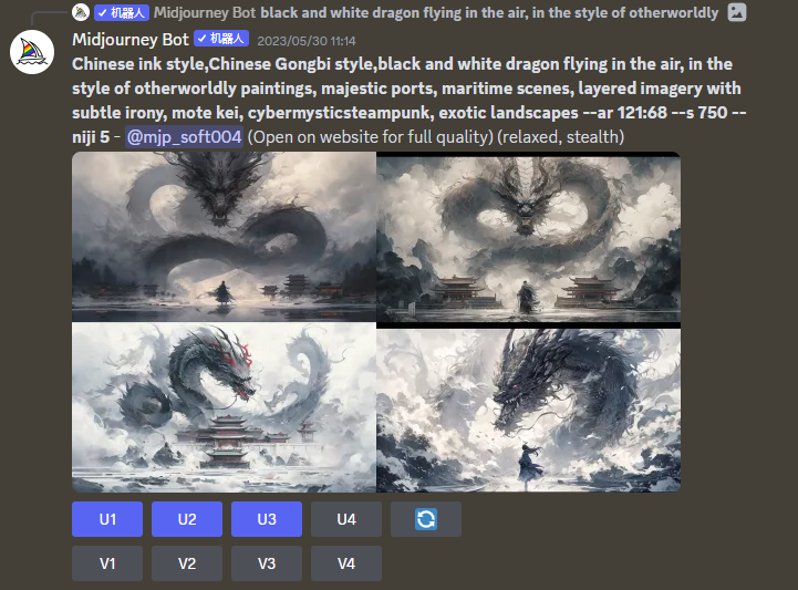 确定元素我们就可以开始在Midjourney生成一系列符合条件的元素。首先从背景的龙和虎开始。