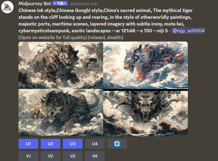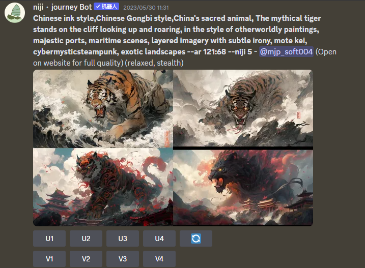 也可以用Niji模式直接生成,有时会有意想不到的结果。对于龙虎,我想加入一些风格化的感觉,所以在提示词加上水墨和工笔风格,大家也可以多多尝试。