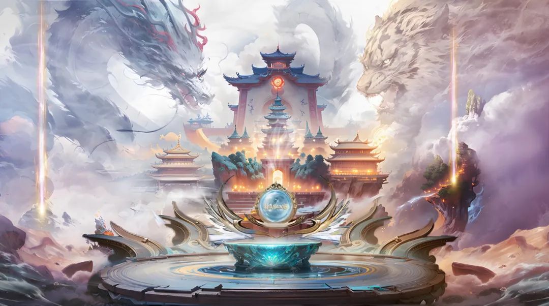 对此,我们可将区域拆解分开制作,提高效率。先根据主题和KV构思下场景的组成:龙,虎和山海,国风的主题比较贴合。