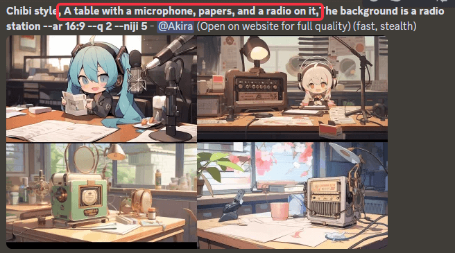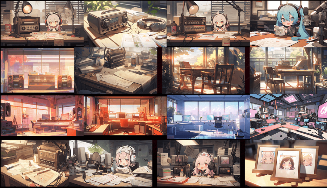 以关键词Chibi style为基础,并作为midjourney的关键咒语,生成电台场景。下图是使用midjourney生成的一系列效果图。