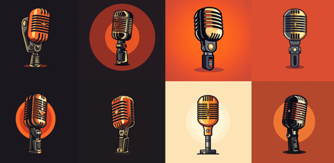 现在,我们来处理标题logo部分。以广播站为主题,我们可以生成一些麦克风的平面图片,并结合自己设计的字体,最后将它们合成为完整的标题logo。