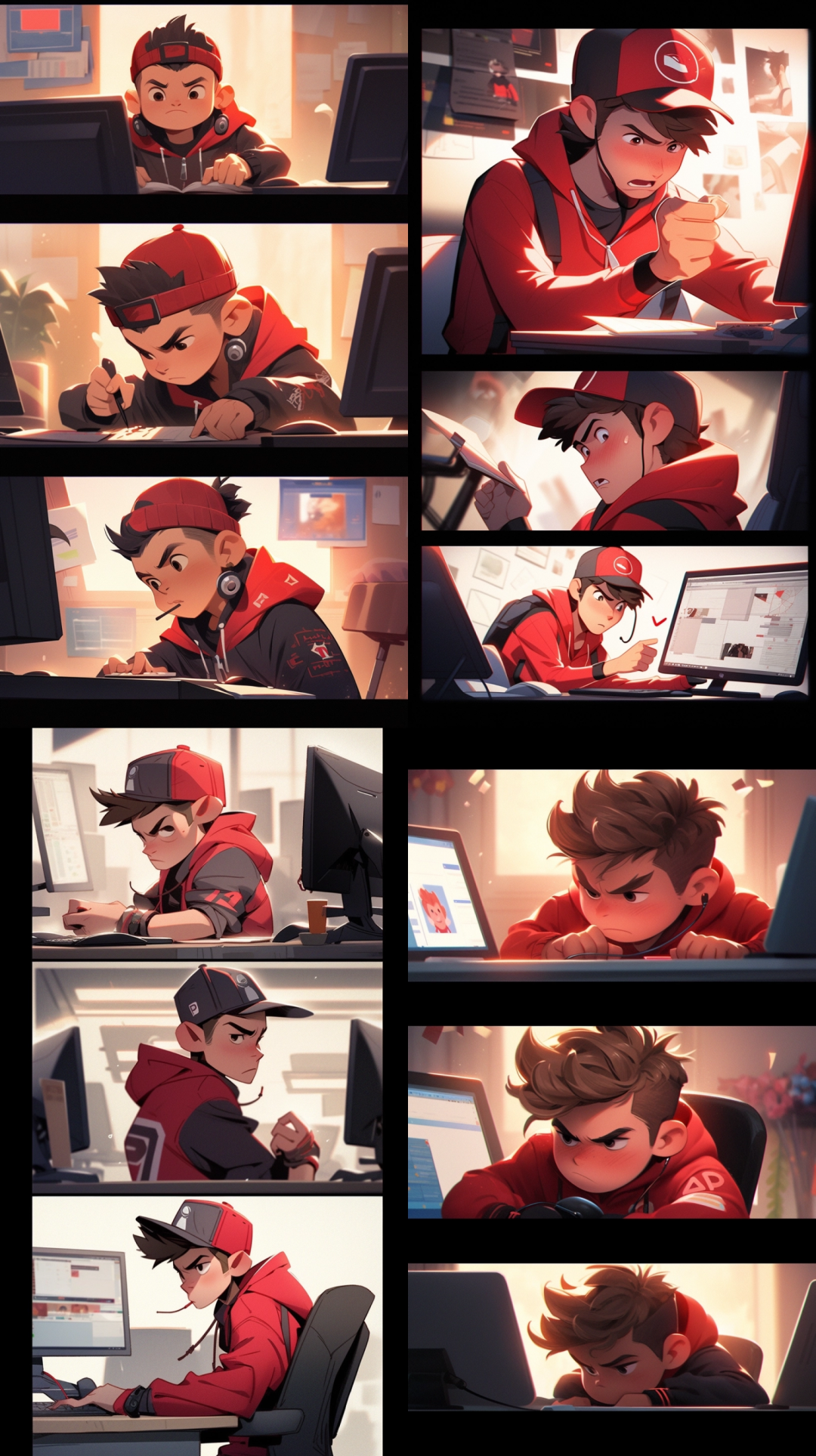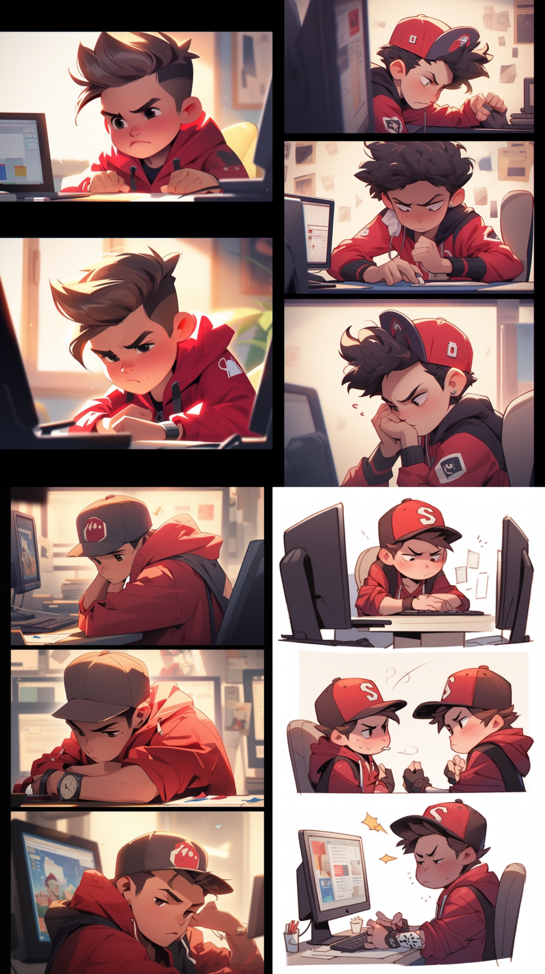Prompt:Animation style, Cartoon animation character, random film stills of DreamWorks Animation, front side back three views, fantasy, a handsome and trendy boy with thick eyebrows and red casquette, red sweater and black pants and blue sneakers, Using an office computer desk as a scenario, A super angry expression, late at night, by Otomo Katsuhiro, manga, ultra-wide shot, cinematic shot,8khd, high detail, hyper quality, High Precision Continuous Shooting / Secuence Shoot / Front Side Back Three Views –ar 9:16 –q 2 –s 750 –niji 5
