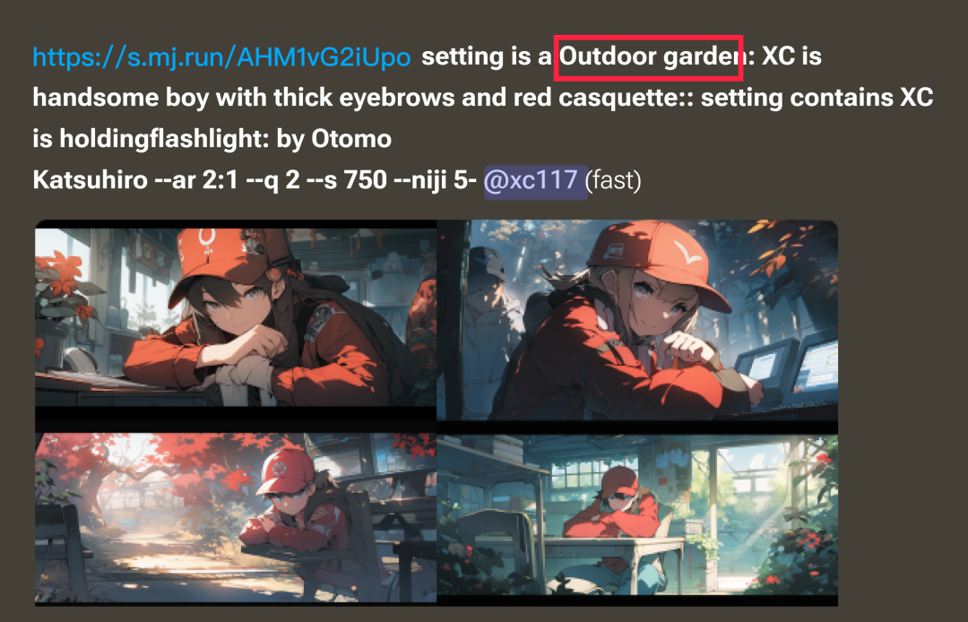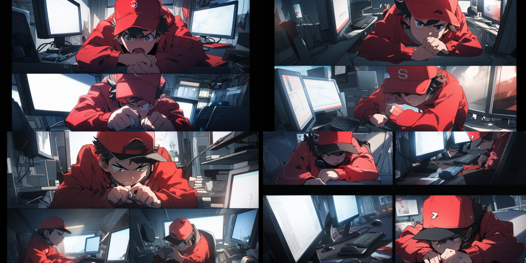 如下图所示:通过描述红色衣服,红色鸭舌帽等比较显眼的描述来控制,并且采取同一个动漫家的风格,这样就可以使得出的图风格、五官和装饰大致相同,达到一部分的视觉统一性。