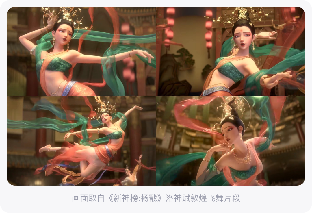 之前比较火热的动画电影《新神榜:杨戬》大受年轻观众的喜爱,也掀起了一股中国神话风热潮。其中洛神赋敦煌飞舞片段中,仙女那古典雅致、轻盈优美的身姿狠狠地戳中我的审美。