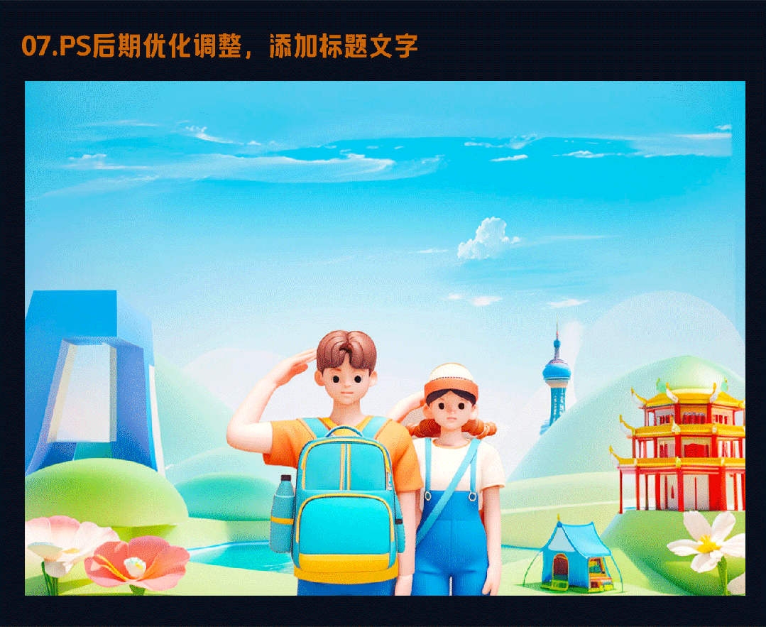 :通过塑造背着书包,特种兵敬礼姿势的出游形象,融合户外景点,打造出一个充满活力和挑战的特种兵出游氛围。