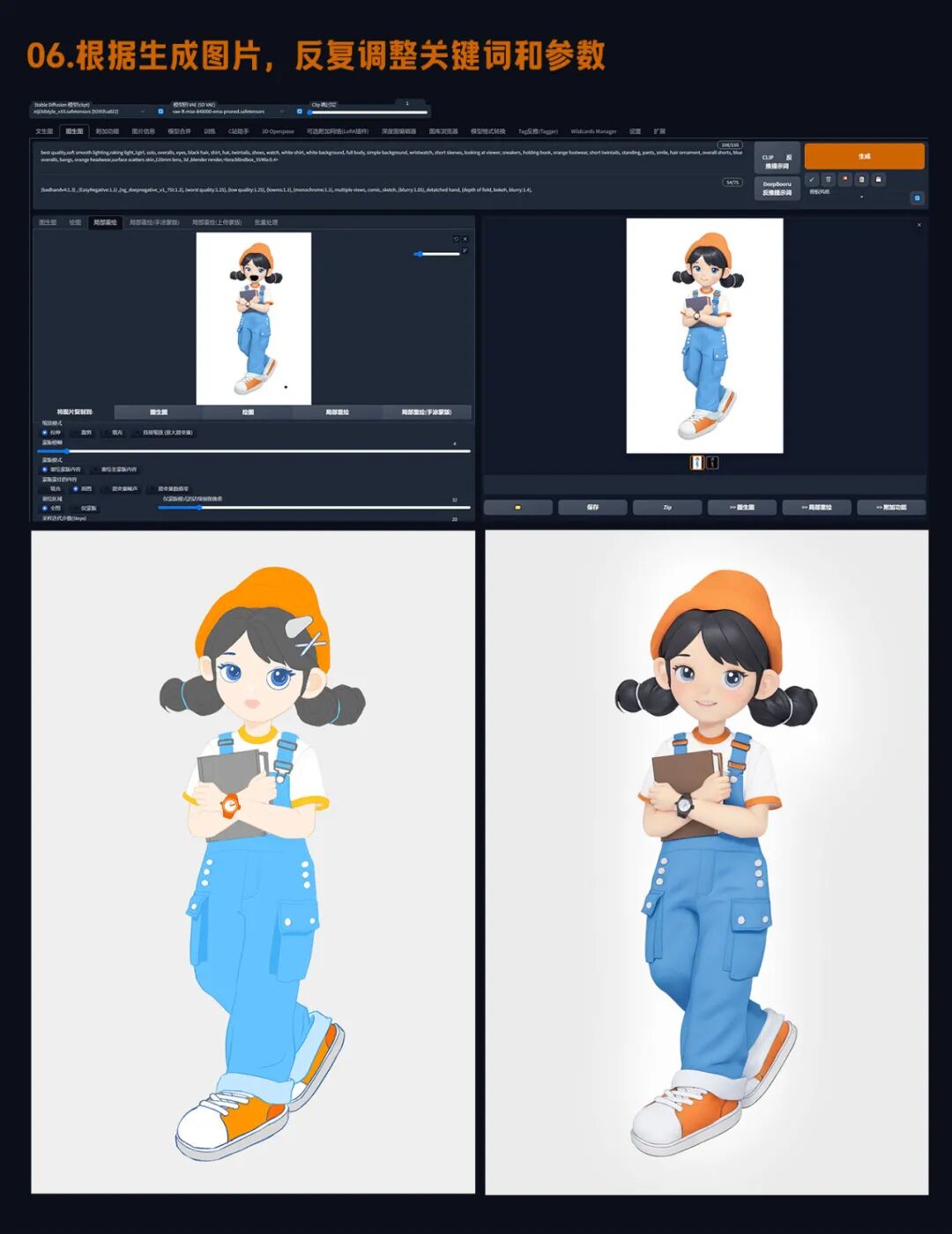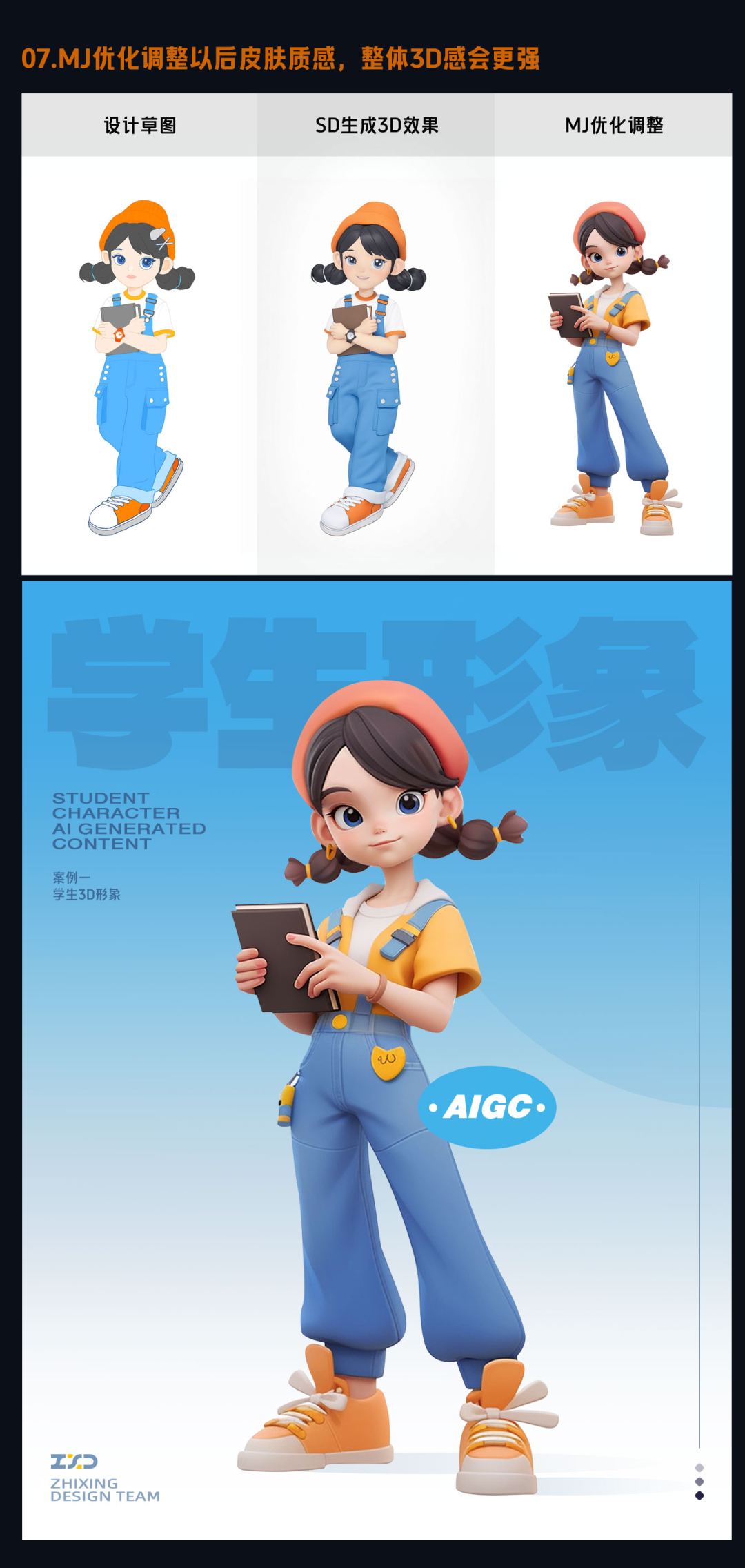Stable Diffusion能精准的把2D形象转换成3D,但现阶段整体3D立体感、皮肤质感欠缺,继续导入Midjourney优化,整体思路如下: