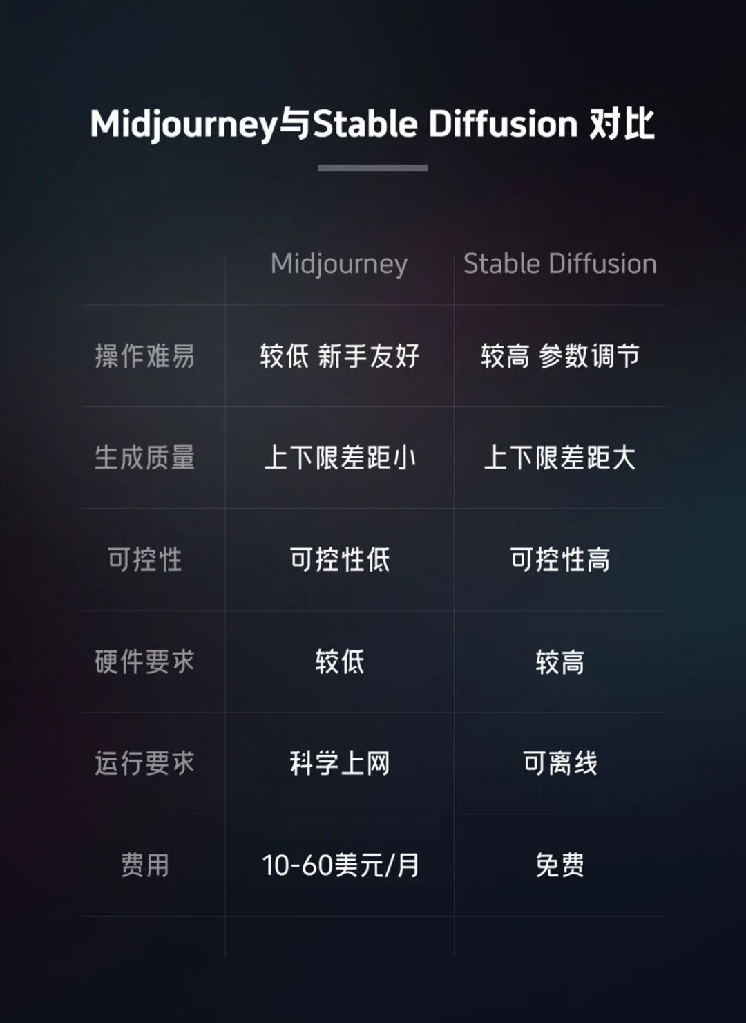 Midjourney和Stable Diffusion是目前市面上最主流的两款AI绘画工具。不少设计师也在纠结哪一款更适合自己。通过以下维度的对比,我们可以更好地选择适合自己的工具。
