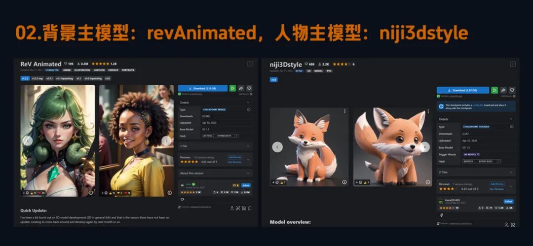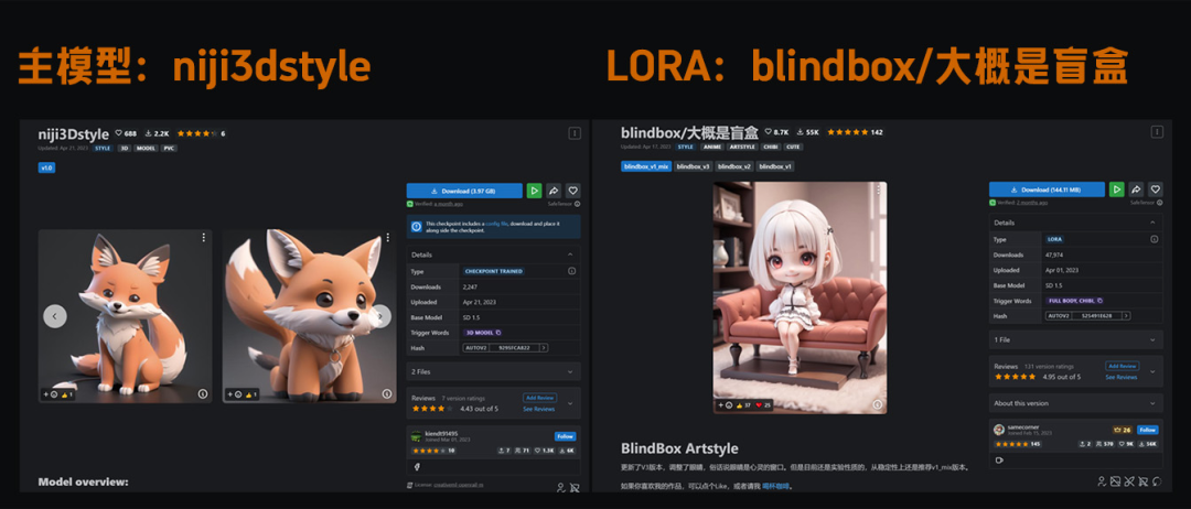 大模型的选择决定了生成的风格,再配合lora对服装、五官、头发等细节进行调节,这里模型选择如下: