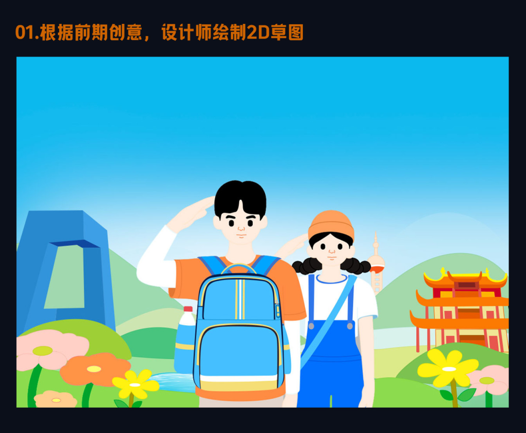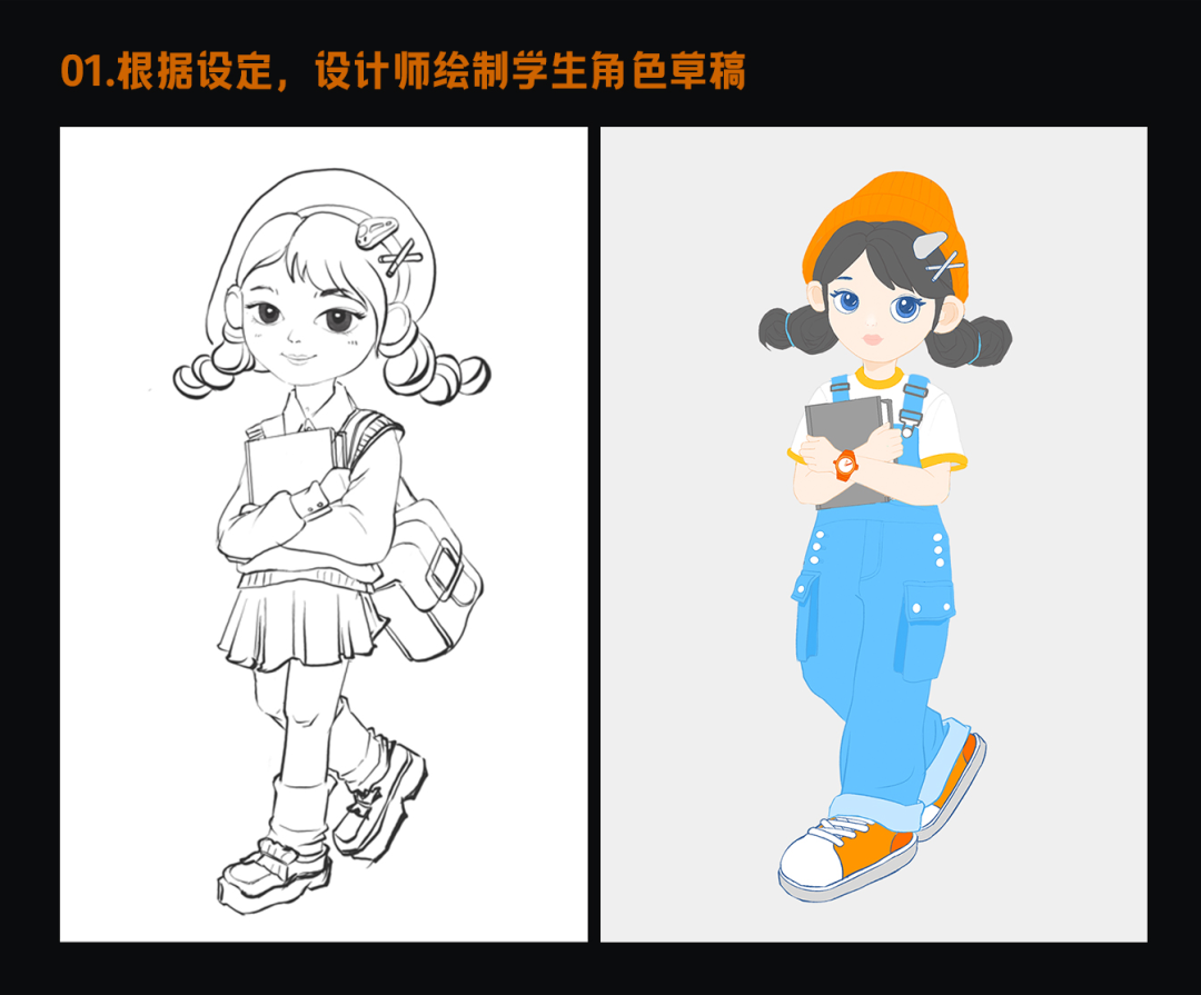 为了更好体现学生的青春活力,整体形象设定为:手拿书本、扎着双马尾、戴帽子,穿背带裤…